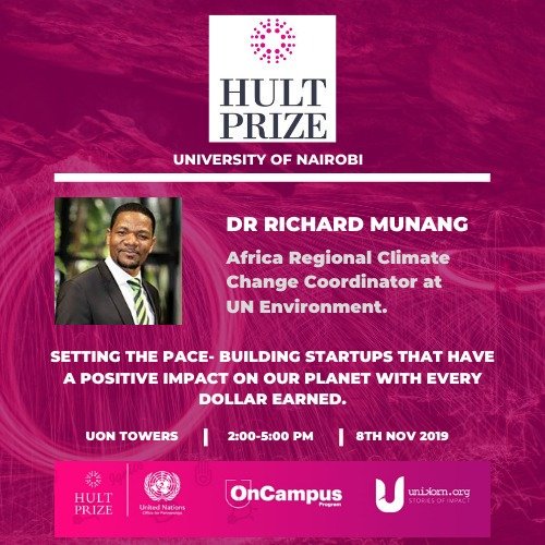 The University of Nairobi Hult Prize OnCampus Program was officially inaugurated by Dr Richard Munang, UN Environment’s Africa Regional Climate Change Coordinator and author of the book “Making Africa Work Through the Power of Innovative Volunteerism” on 8th November 2019. He delivered a keynote address and an engaging discussion with the participants on how youth can leverage on Climate Action to drive enterprise opportunities. He remarked that successful entrepreneurship in Africa depends upon tapping value chains aligned with the continent’s areas of comparative advantage. These ideas become more profound with impactful enterprises that build a better planet. He concluded by admonishing the participants to develop their unborrowed vision to be able to drive enterprises that create a positive impact on our planet with every dollar earned. He emphasized that we are our biggest assets and only we can limit ourselves. Our biggest ability is our availability. It’s not about eloquence but action.